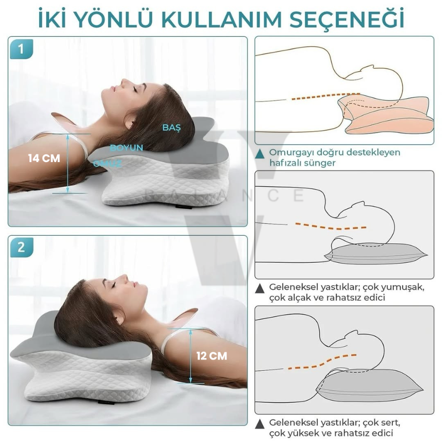 ViscoBalance yastığımızın iki yönlü kullanımı ve çift yükseklik özelliği sayesinde, kişisel tercihinize ve uyku pozisyonunuza göre maksimum destek sağlar. Böylece, hem boynunuzu hem de omurganızı ideal şekilde hizalayarak konforlu bir uyku sunar.